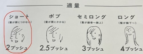 ショート2プッシュとの記載がありますが、1プッシュの量が多い事から1プッシュでも十分かと思いました(゚o゚;; (筆者毛量やや多め)