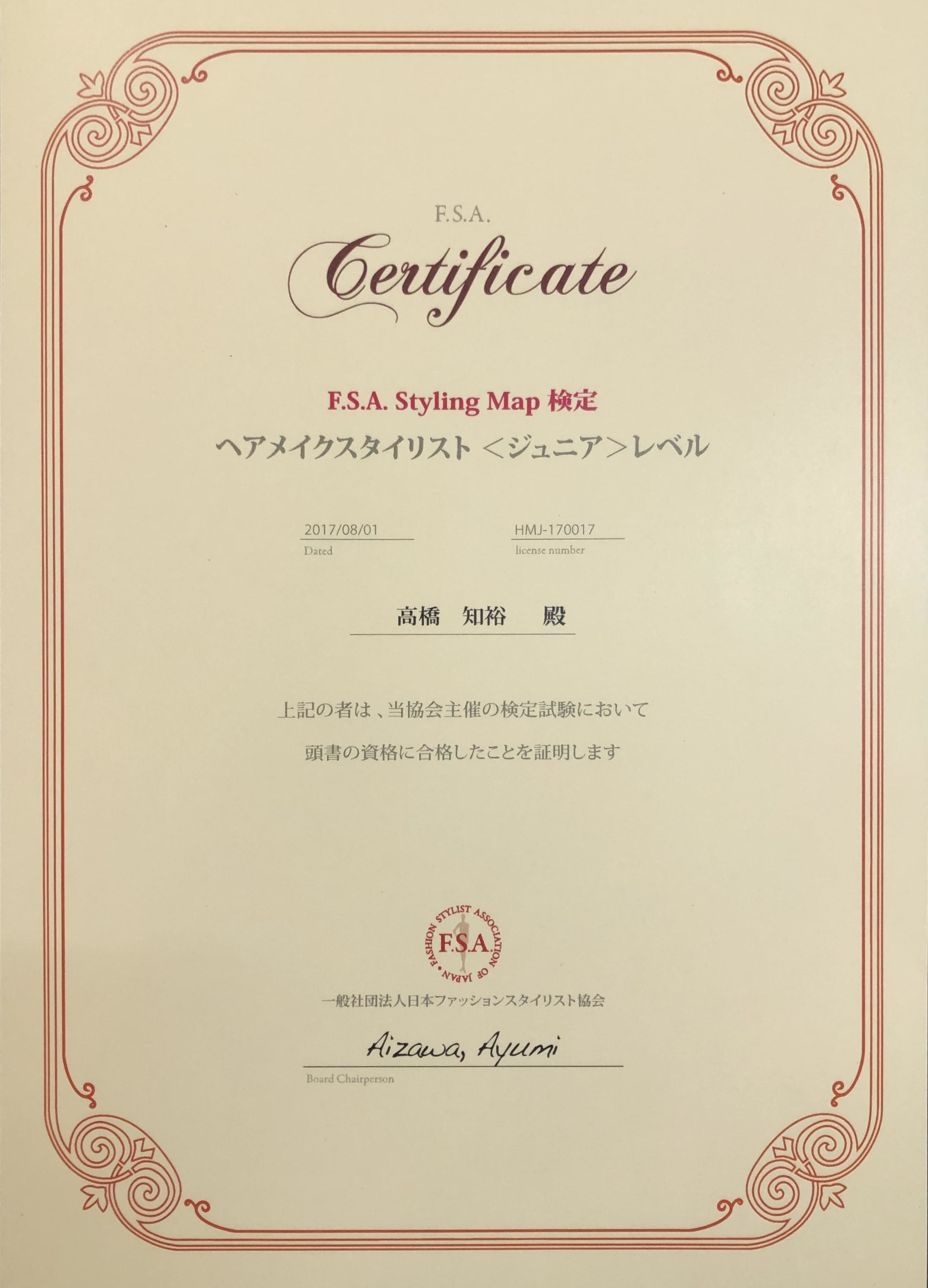 一般社団法人日本ファッションスタイリスト協会の「F.S.A. Styling Map 検定」にスタッフ全員が合格しております。