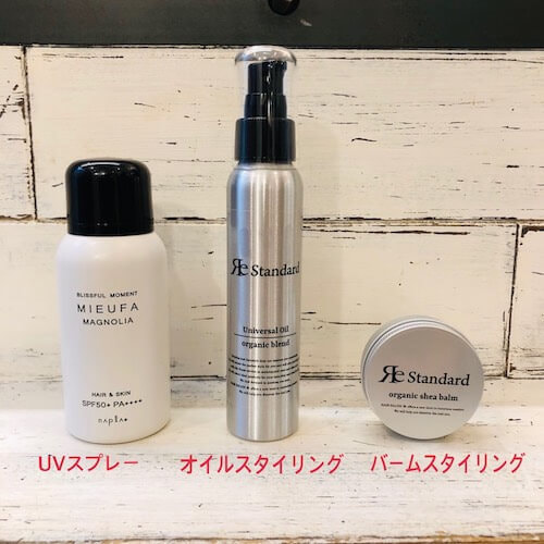 巻き終えたら保湿剤(バームやオイル等)をつけ、上からUVスプレーを使用し、乾燥と紫外線からダブルで髪を守って外出!