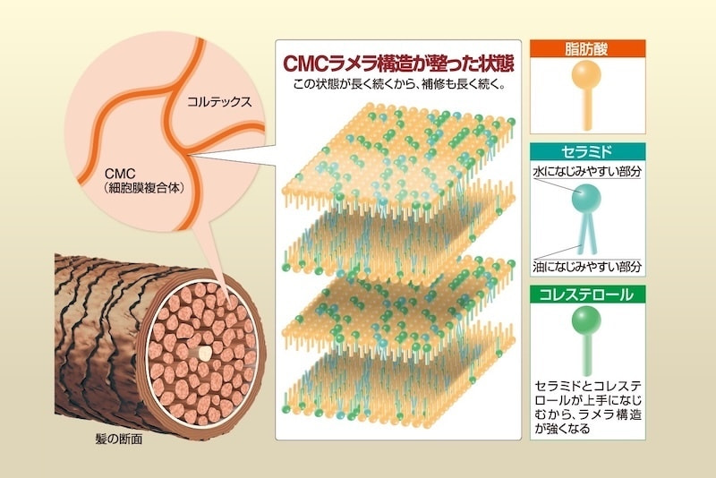美しい髪を保つには、髪の主成分である**「ケラチン」をしっかり補給し、髪の水分を保持する「セラミド」**を守ることが大切です。