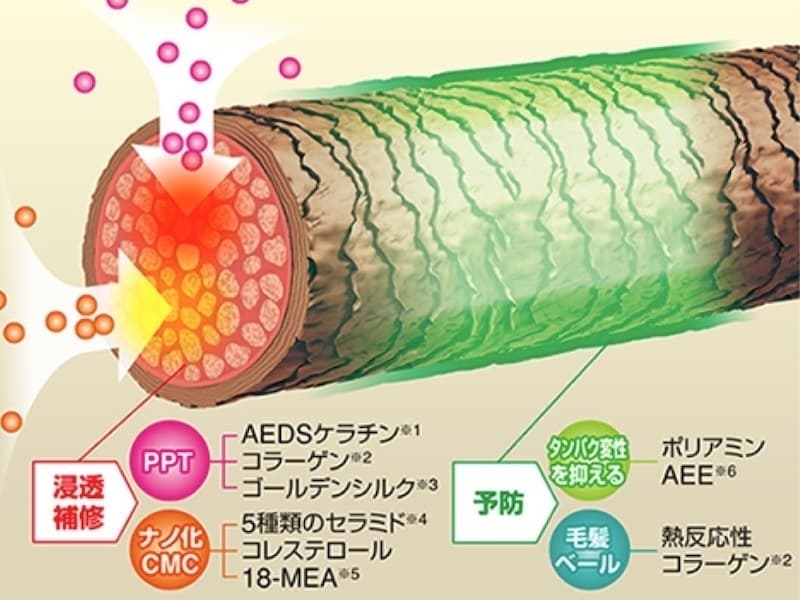 紫外線・熱・摩擦・ヘアカラー・パーマなどのダメージによってケラチンが失われると、髪が弱くなり、ツヤがなくなるため、しっかり補給することが大切です。